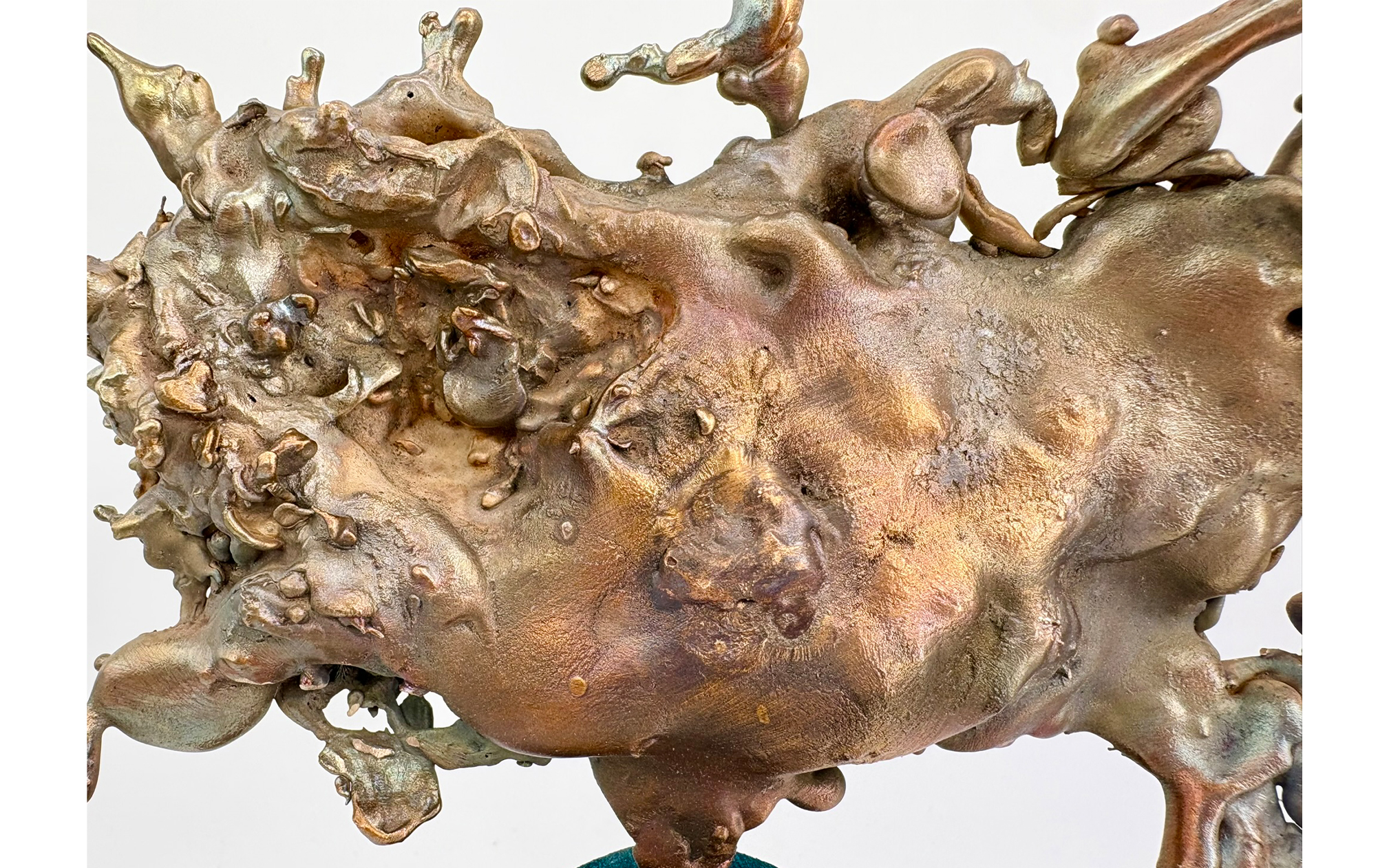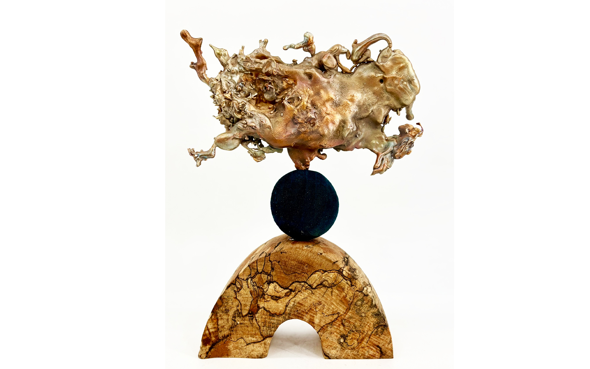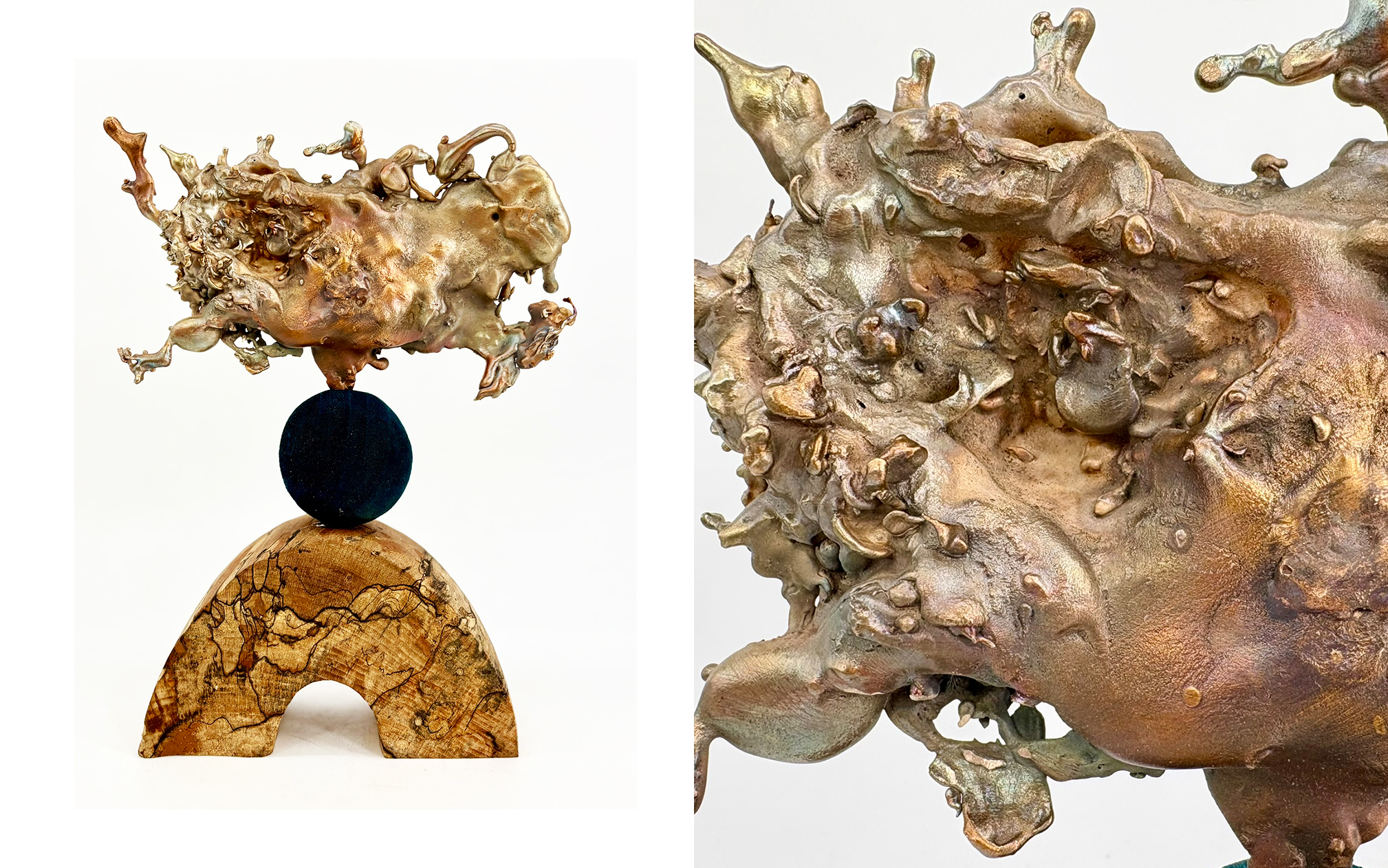 Patinated bronze, maple wood and paulownia wood stained with watercolor.