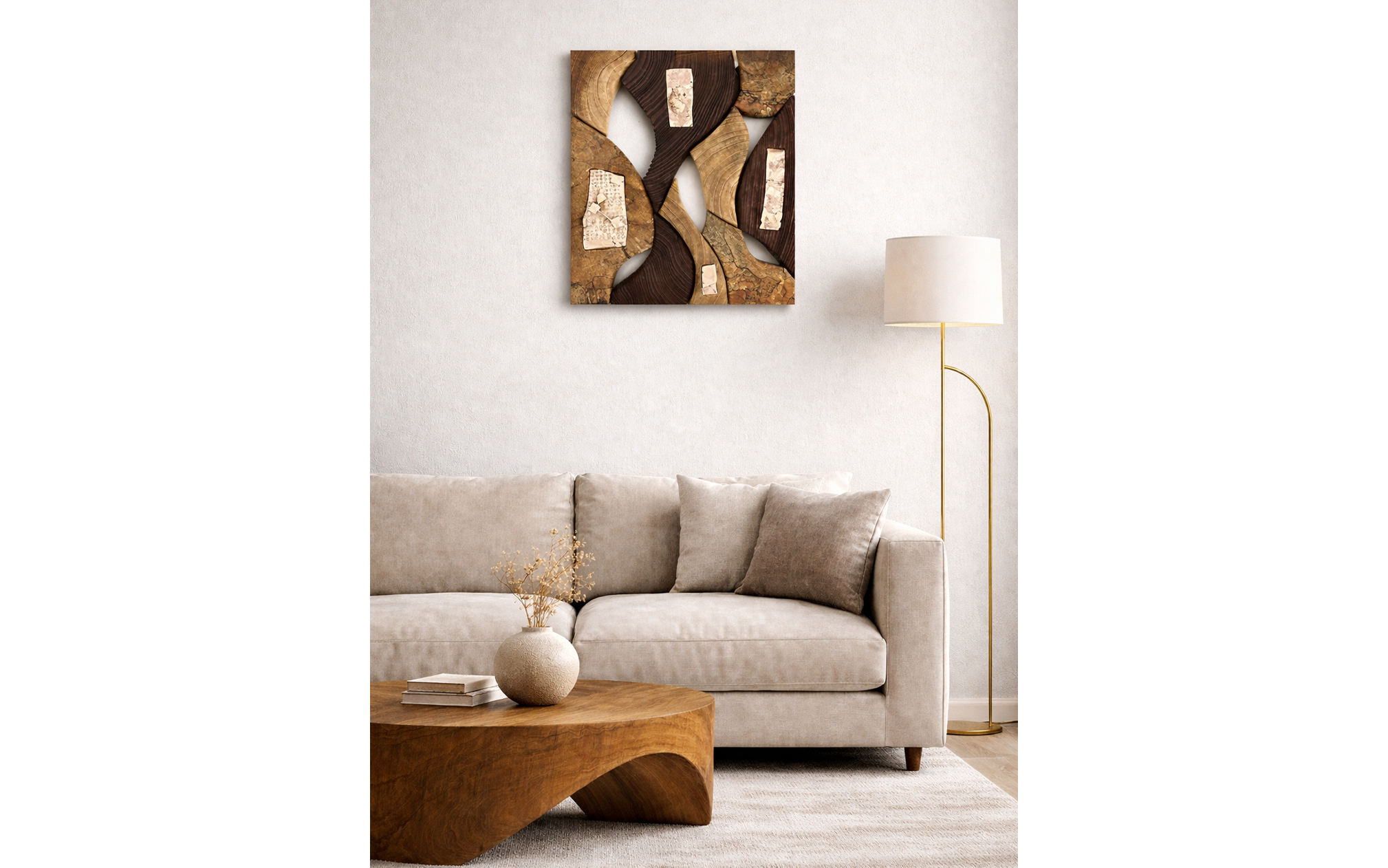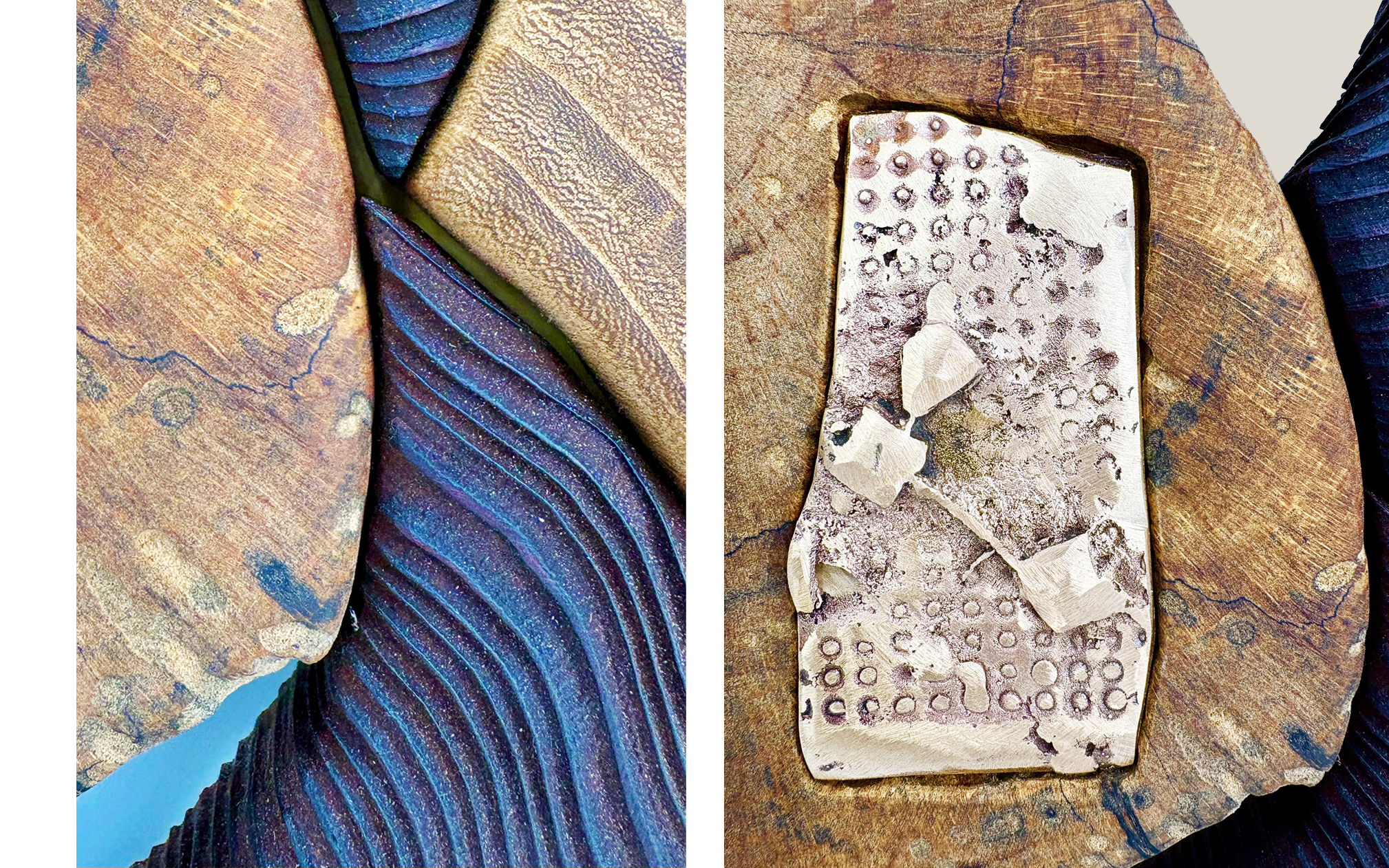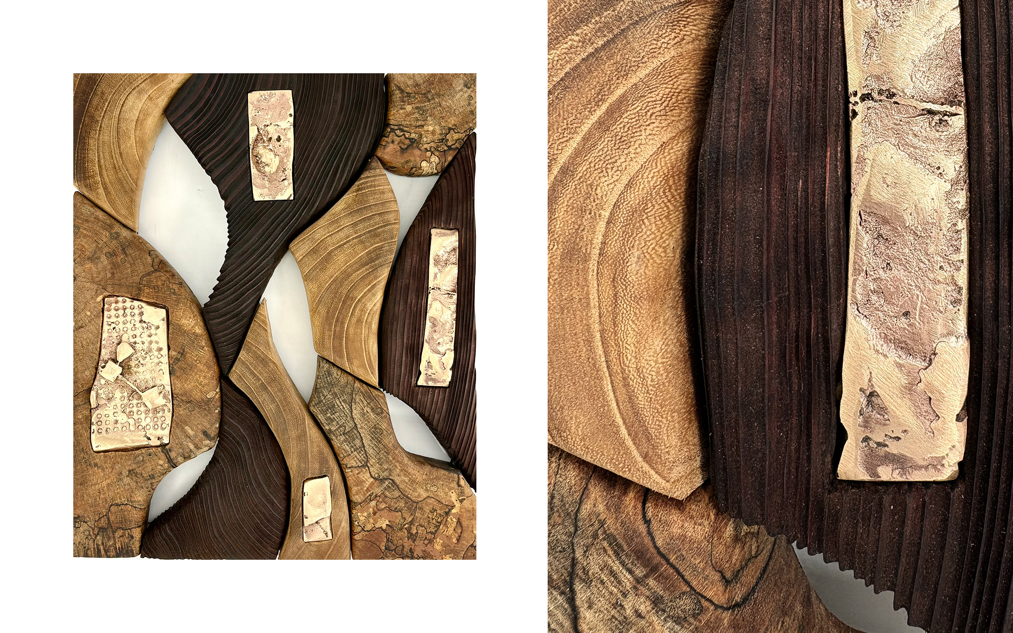 Bronze, eroded redwood, maple wood, paulownia wood.