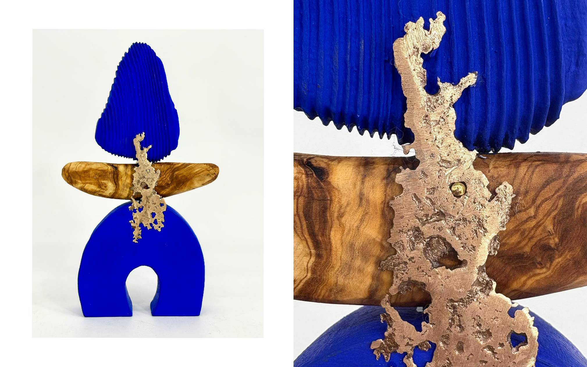 Bronze, bois de sequoia, bois d’olivier, bois de paulownia.